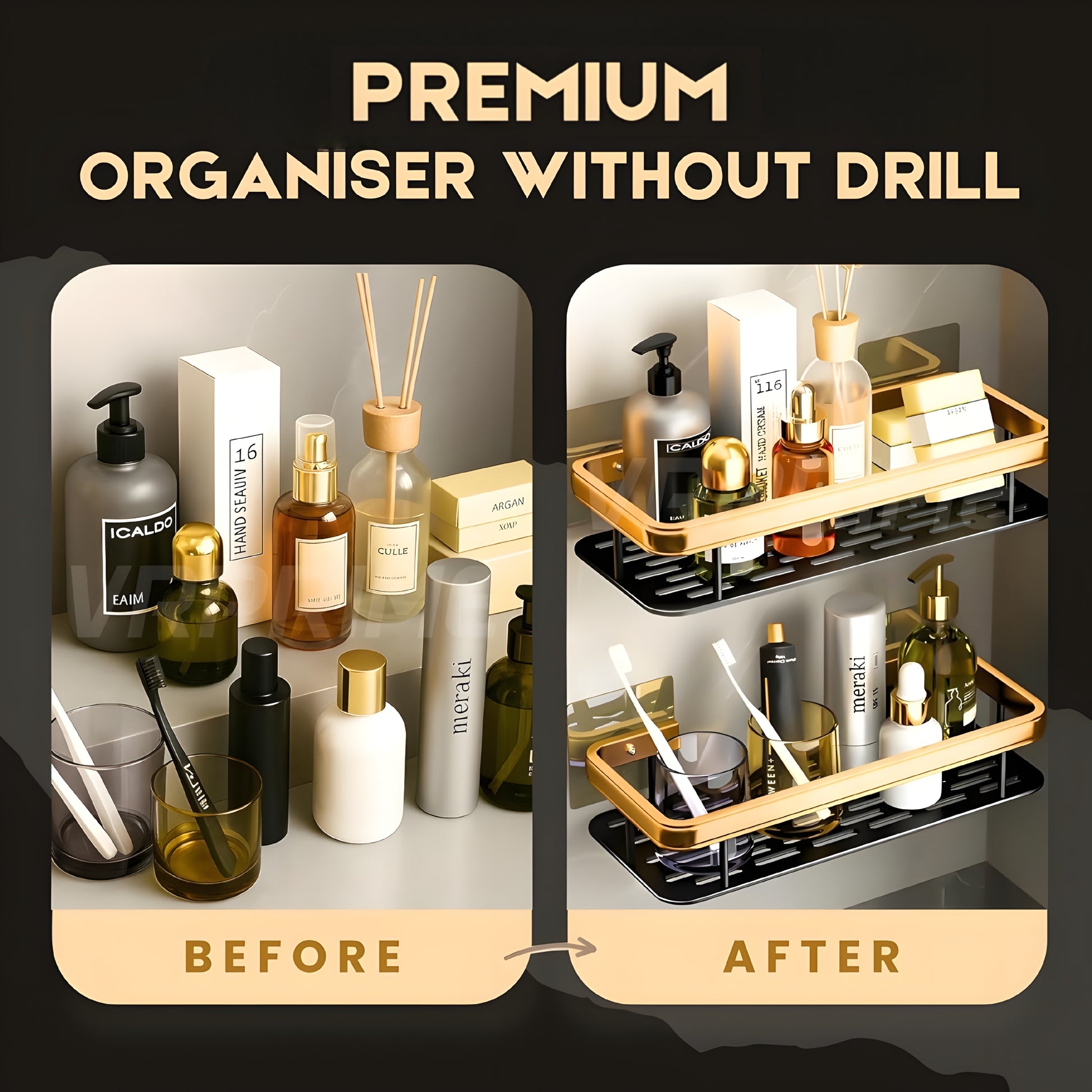Transform your bathroom into a stylish and organised space with this luxury bathroom wall shelf. Featuring a gold-finished frame and a sleek black base, it blends modern elegance with high functionality to keep your essentials neat, accessible, and beautifully displayed.
